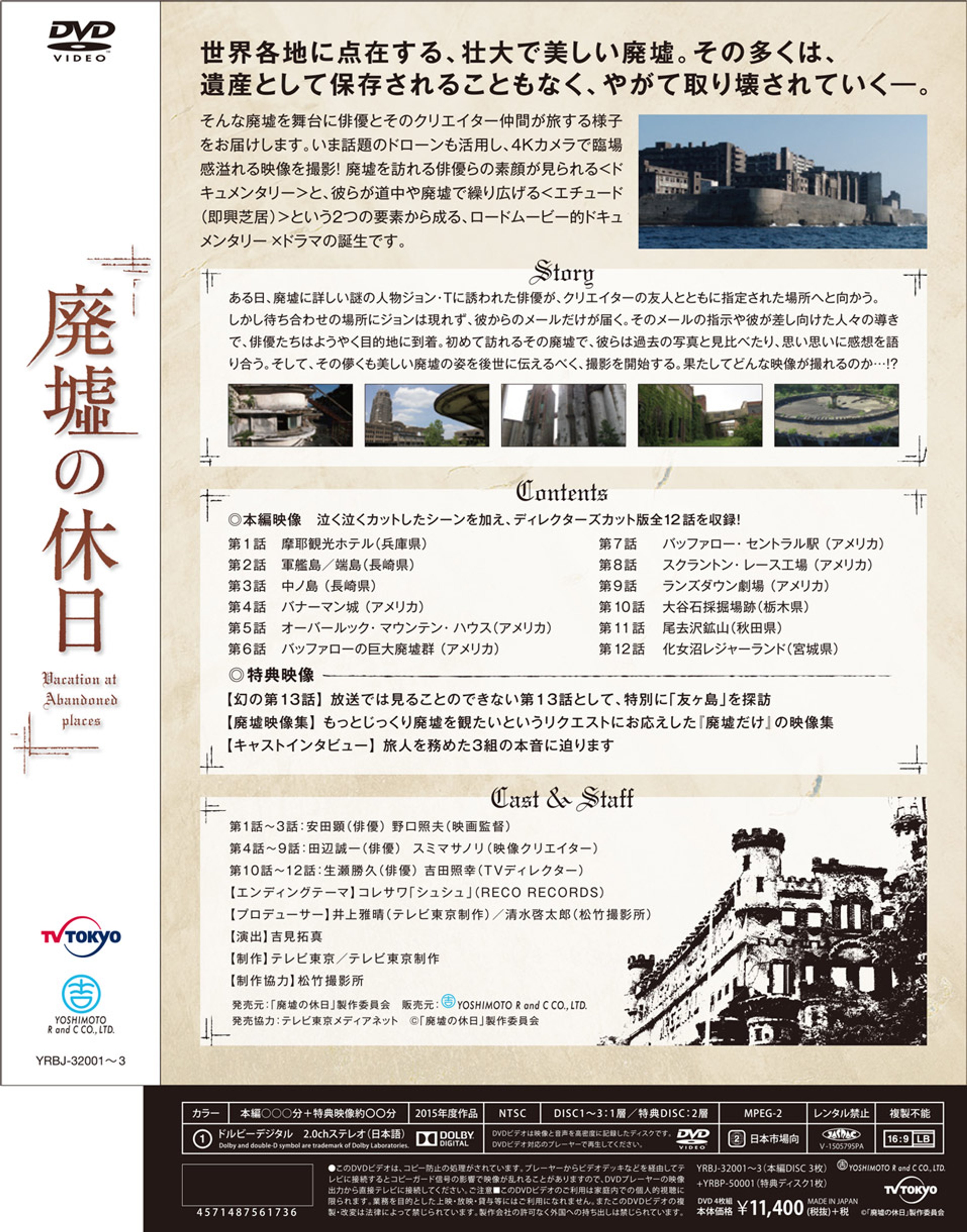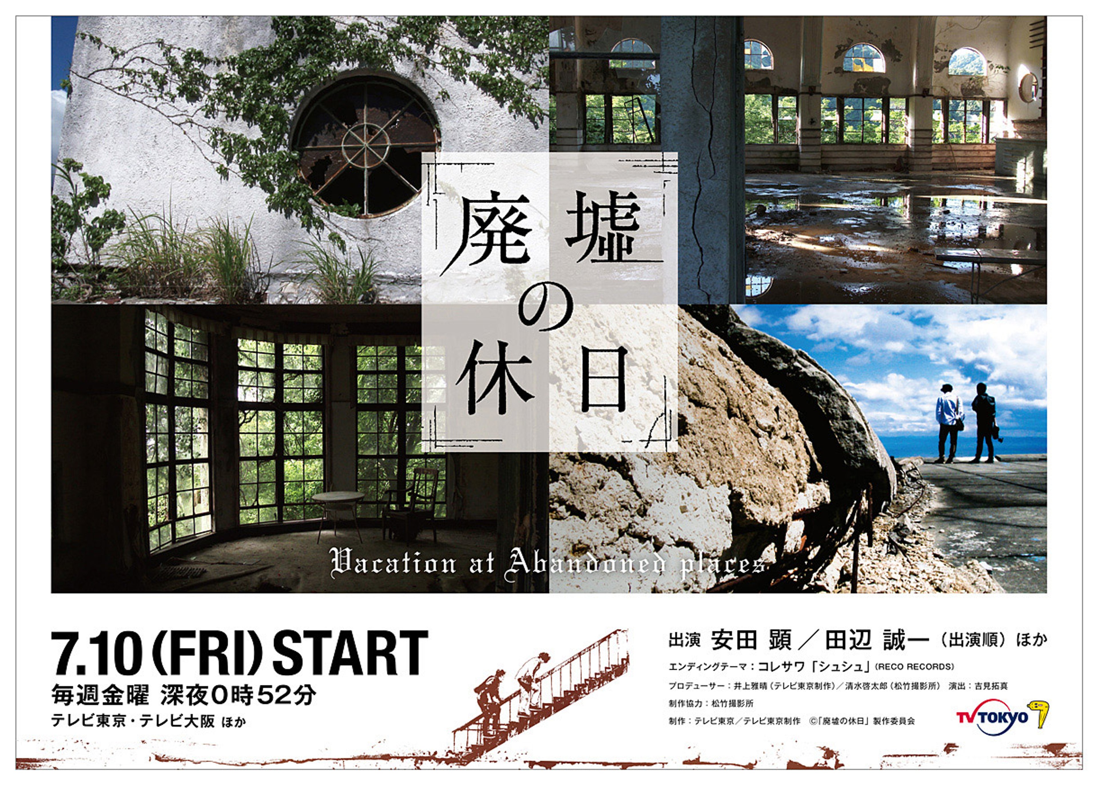 2015年、テレビ東京で放映された、ロードムービー的ドキュメンタリー番組。国内外の壮大な廃墟の数々の、美しく、耽美な世界を4Kカメラで切り取り、クリエーター × 俳優 がディスカッションしながら訪れる記録映像です。タイトルロゴは、廃墟の持つ奥深い幻想的な印象、紀行番組エッセンス、ロードムービーの乾いたイメージを、整然と組んだタイポグラフィと廃墟風の朽ちた罫線で表現し、欧文サブキャッチをブラックレターを用いるなどして構成しヴィジュアル化しました。
