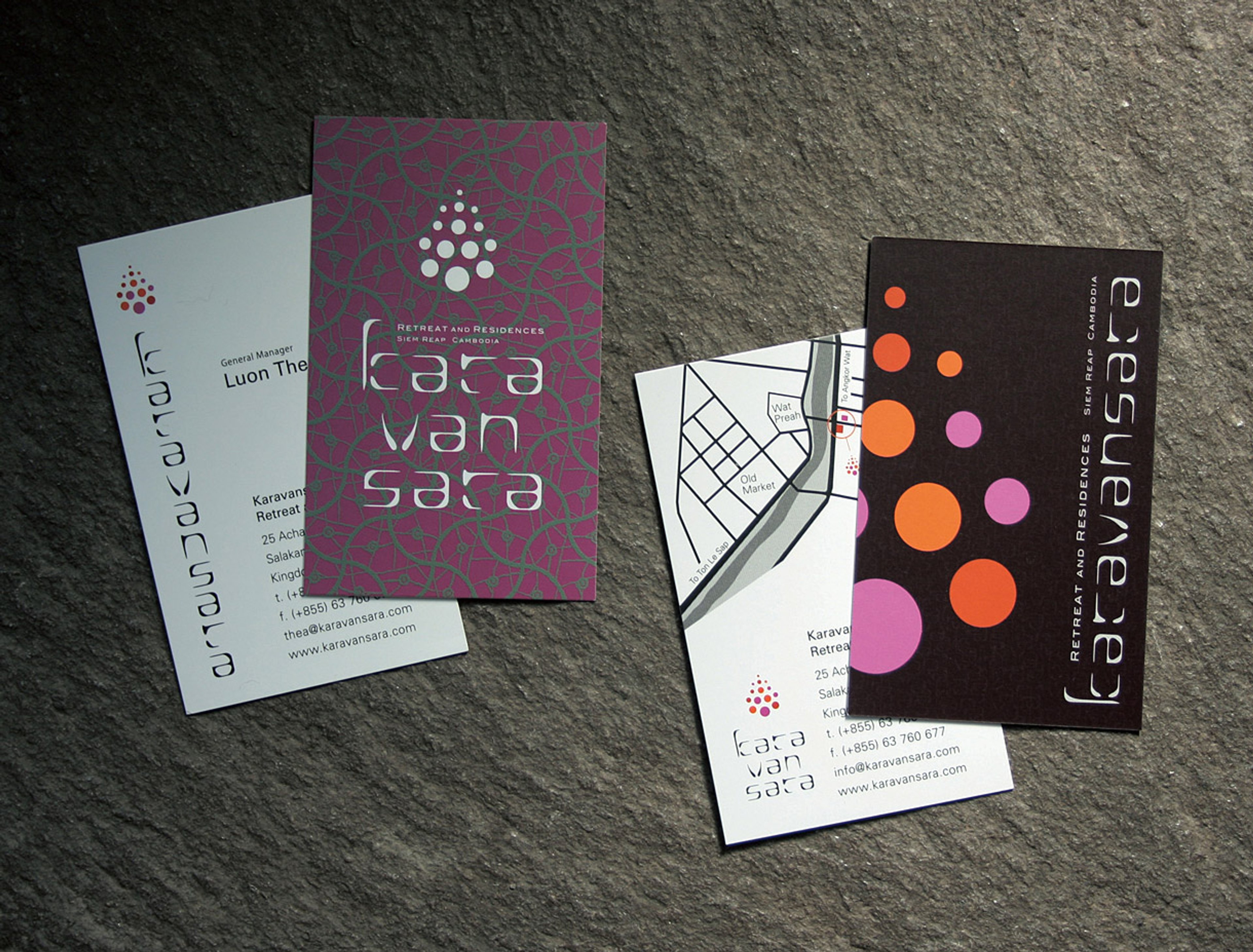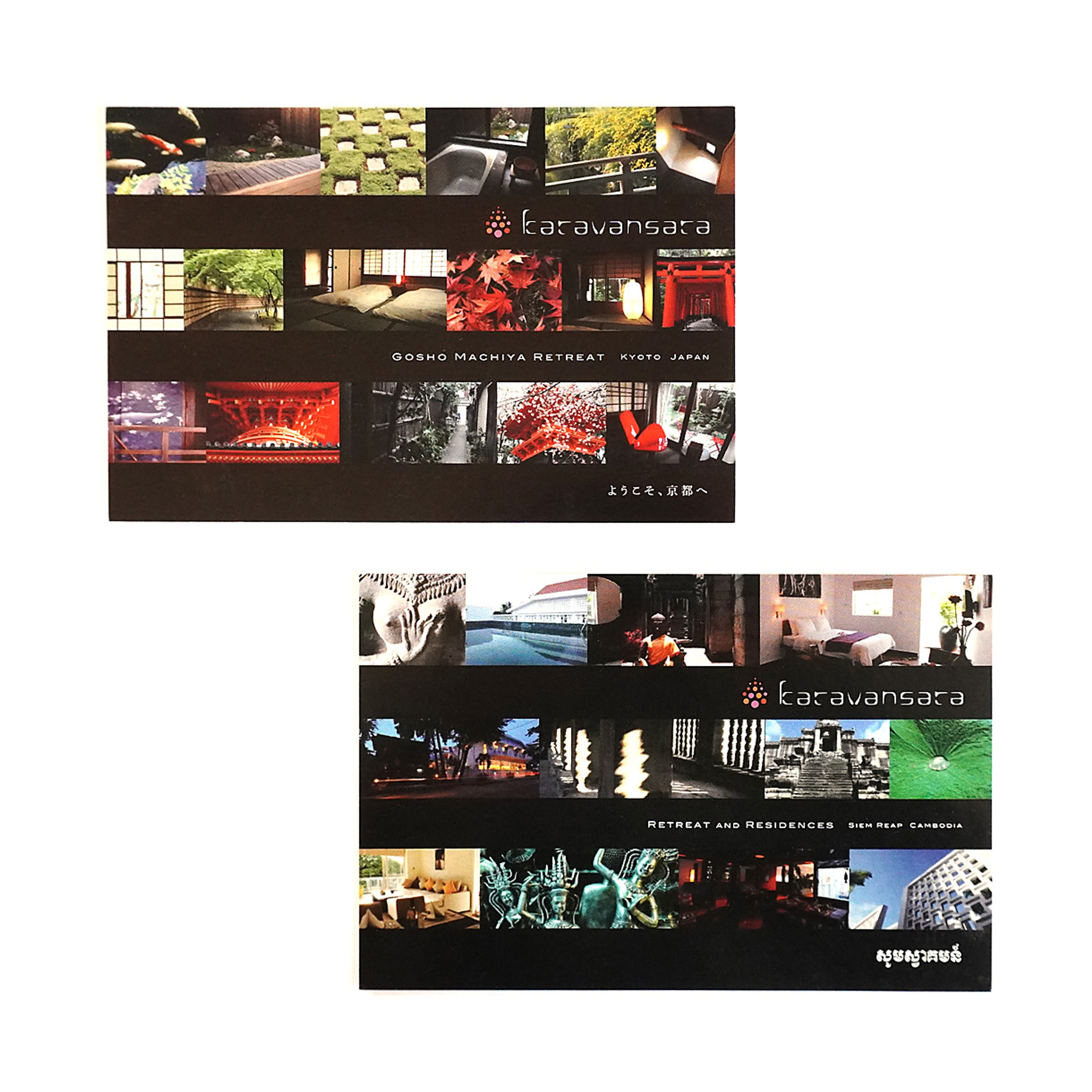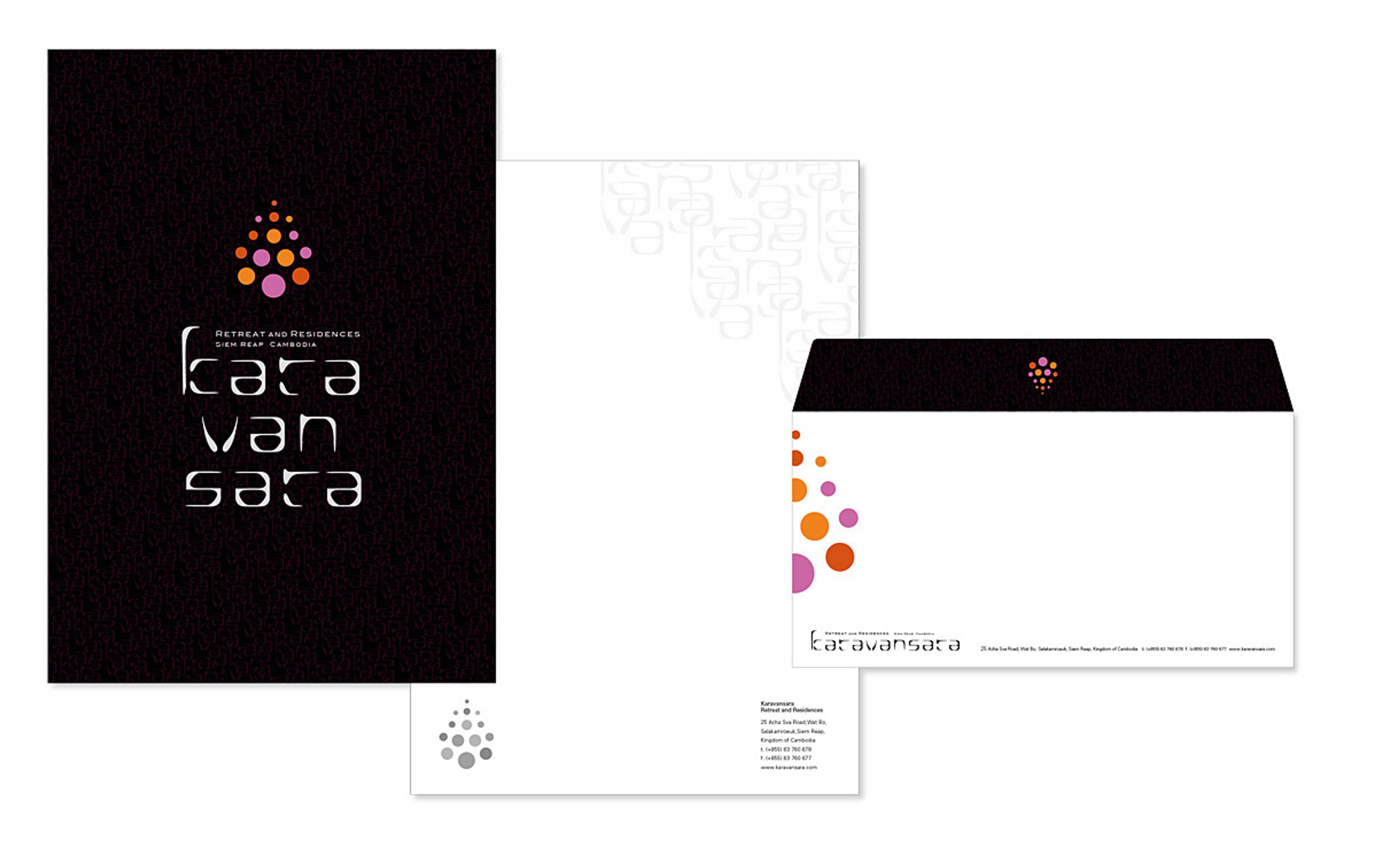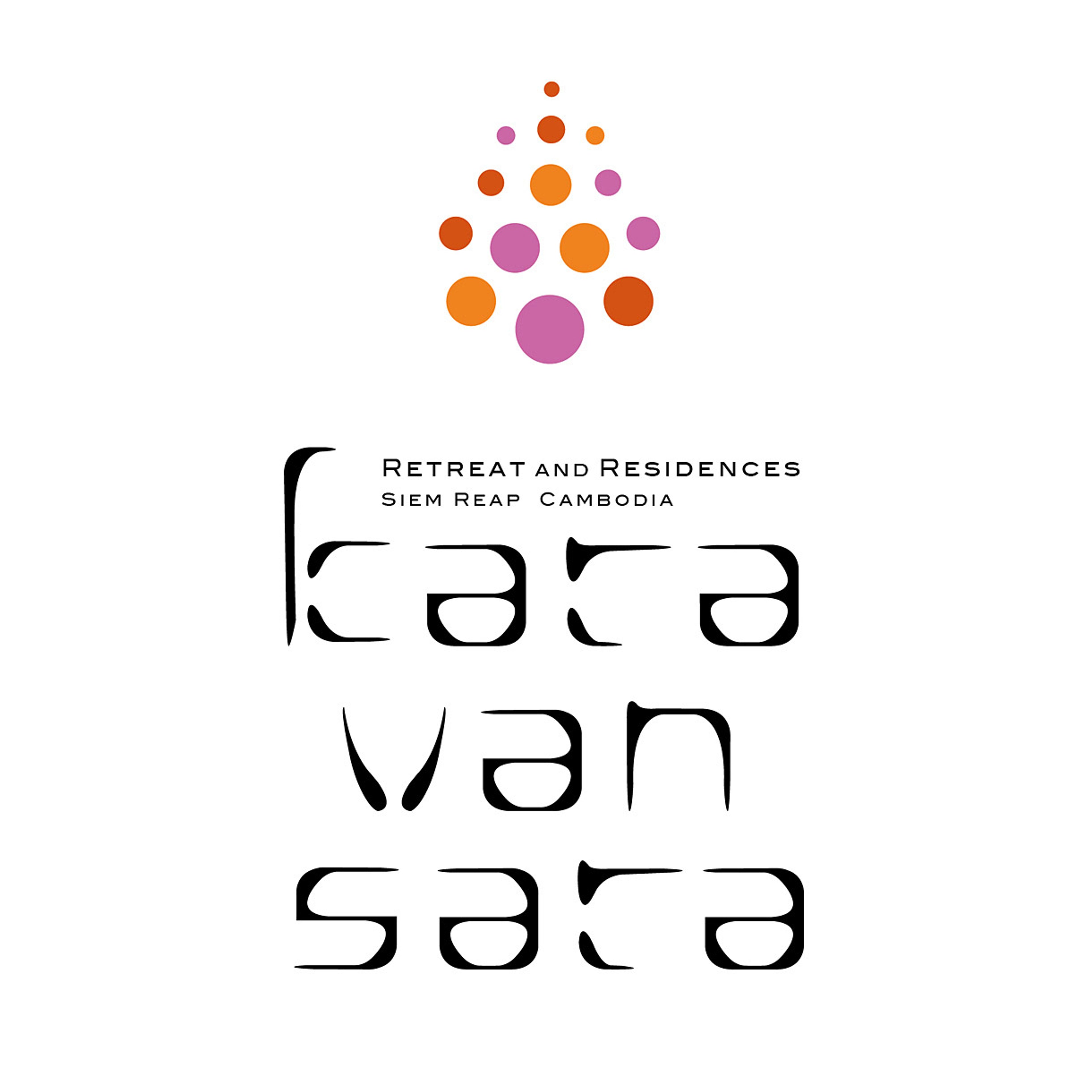 カンボジア・シェムリアップのリトリートホテル「カラヴァンサラ」。アンコール遺跡群にほど近く、美しい自然環境に囲まれ、カンボジアの伝統様式を継承した建築デザインで、白、黒、赤を基調としたモダンなインテリア空間です。カラヴァンサラとはキャラバン・サライのアラビア語で「隊商の宿泊施設」の意味。様々な国から旅人が、日常生活から離れて集まる静修の場所としてネーミングされました。シンボルマークは、仏の慈悲と智慧の象徴である「蓮」や、半跏趺坐の「仏陀」をイメージし、重くなりすぎないようポップな色彩構成にしています。