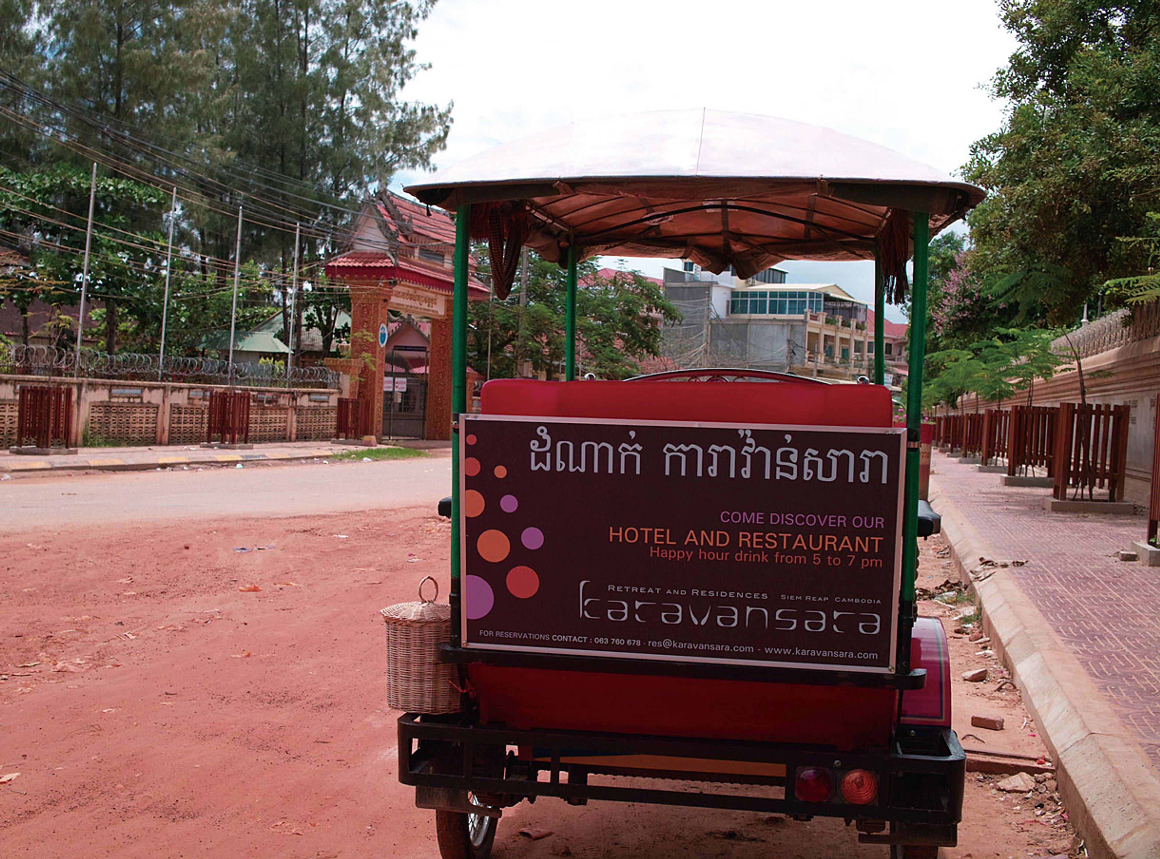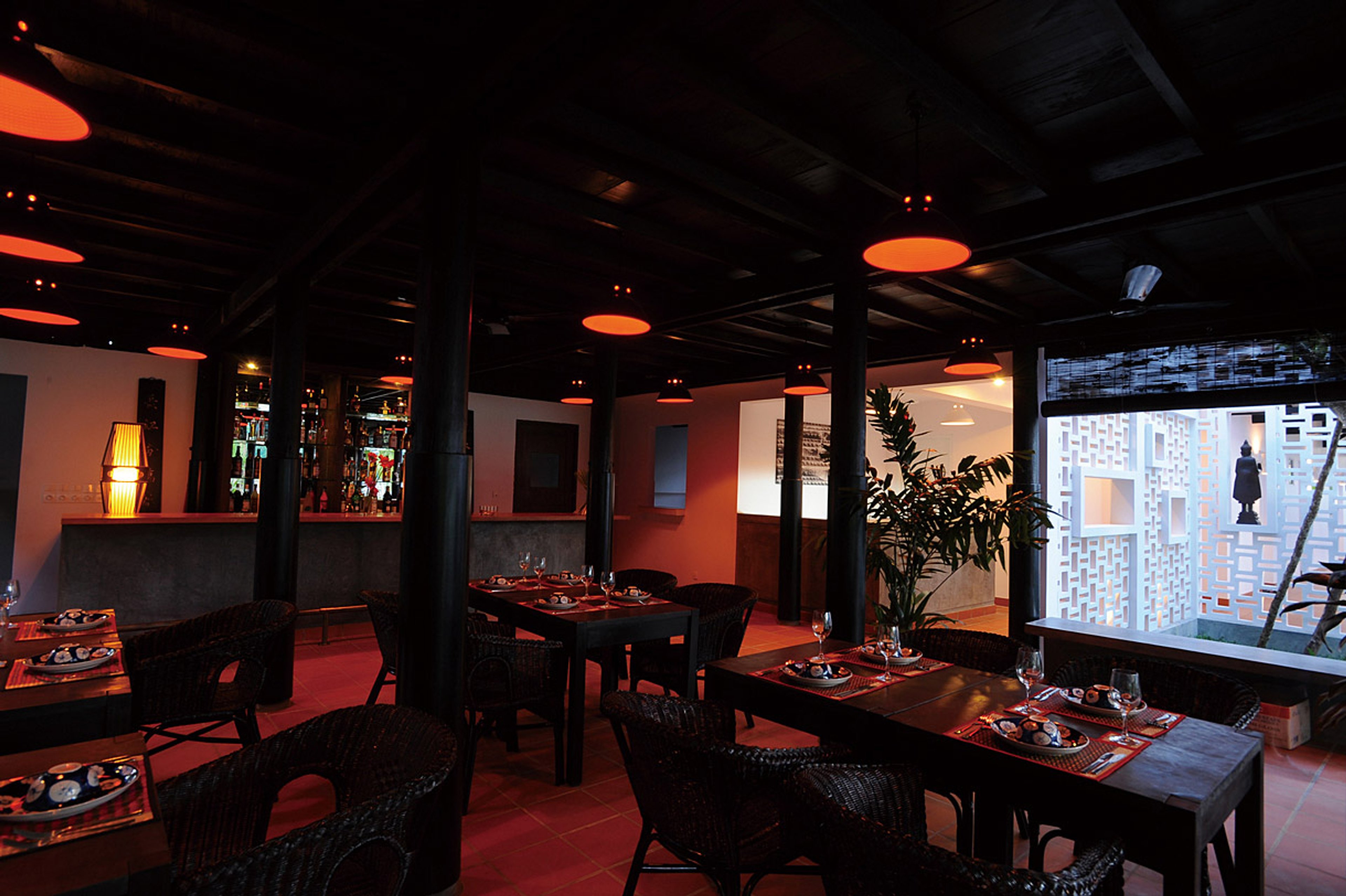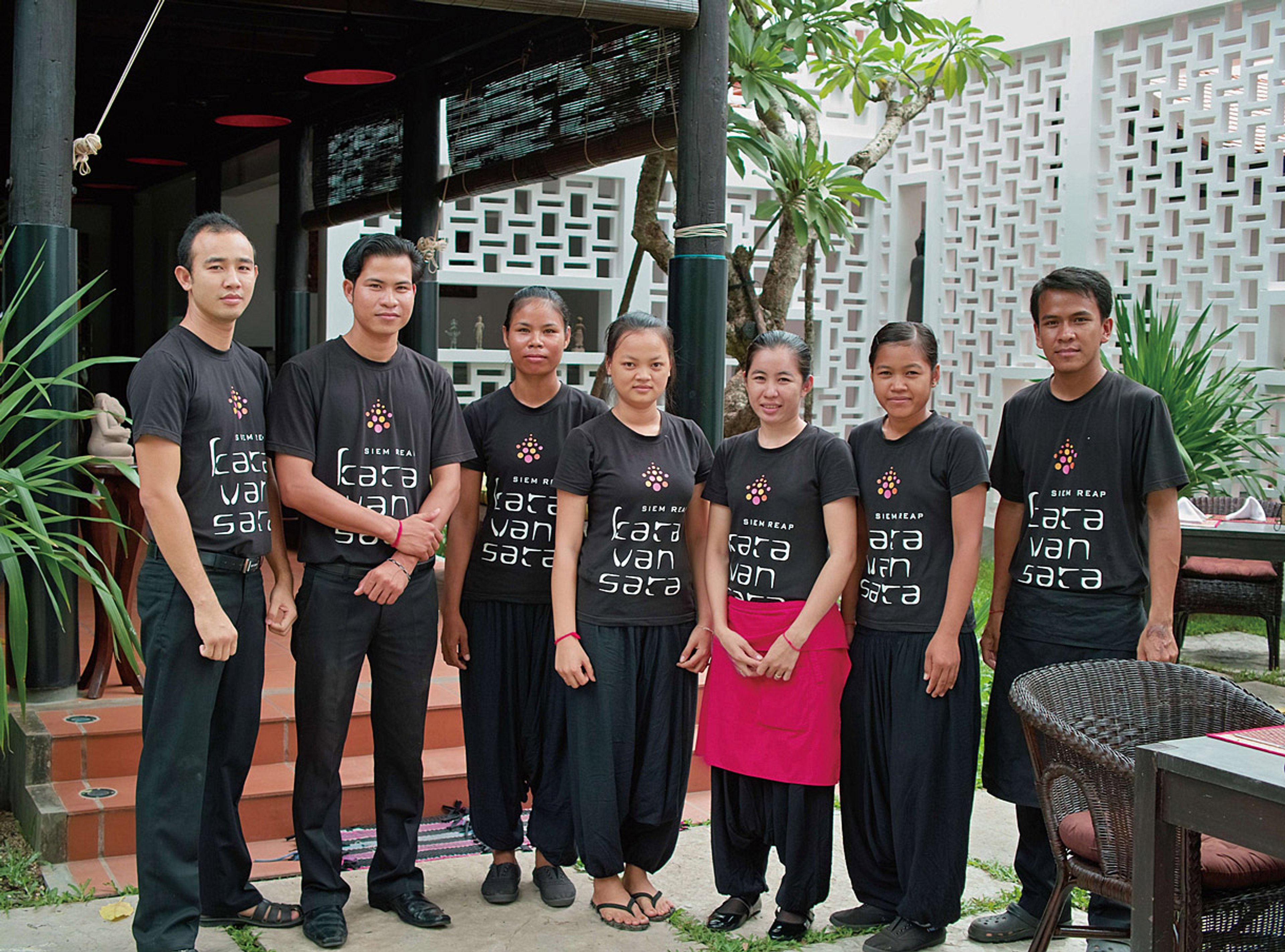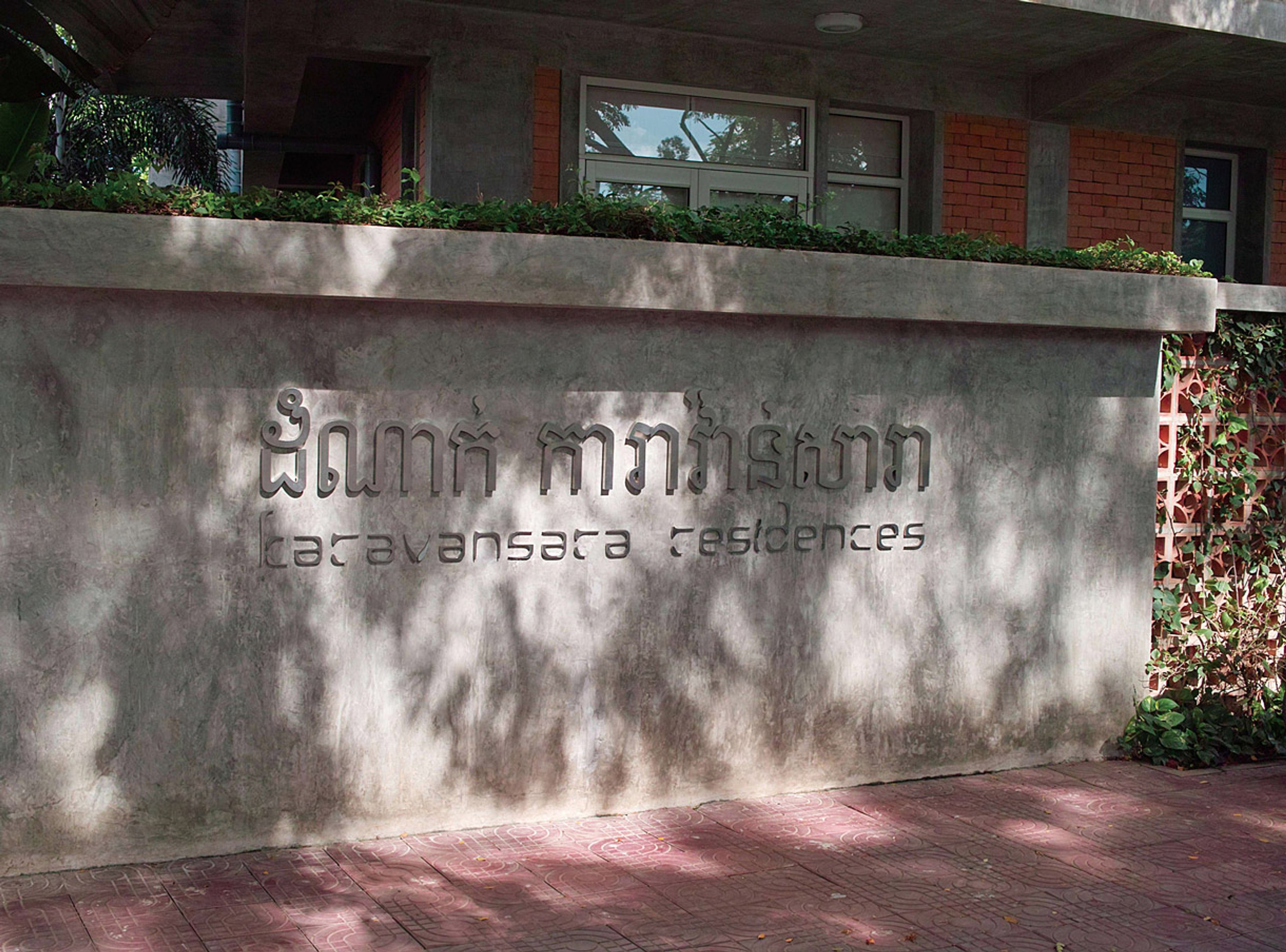 カンボジア・シェムリアップのリトリートホテル「カラヴァンサラ」。アンコール遺跡群にほど近く、美しい自然環境に囲まれ、カンボジアの伝統様式を継承した建築デザインで、白、黒、赤を基調としたモダンなインテリア空間です。カラヴァンサラとはキャラバン・サライのアラビア語で「隊商の宿泊施設」の意味。様々な国から旅人が、日常生活から離れて集まる静修の場所としてネーミングされました。シンボルマークは、仏の慈悲と智慧の象徴である「蓮」や、半跏趺坐の「仏陀」をイメージし、重くなりすぎないようポップな色彩構成にしています。