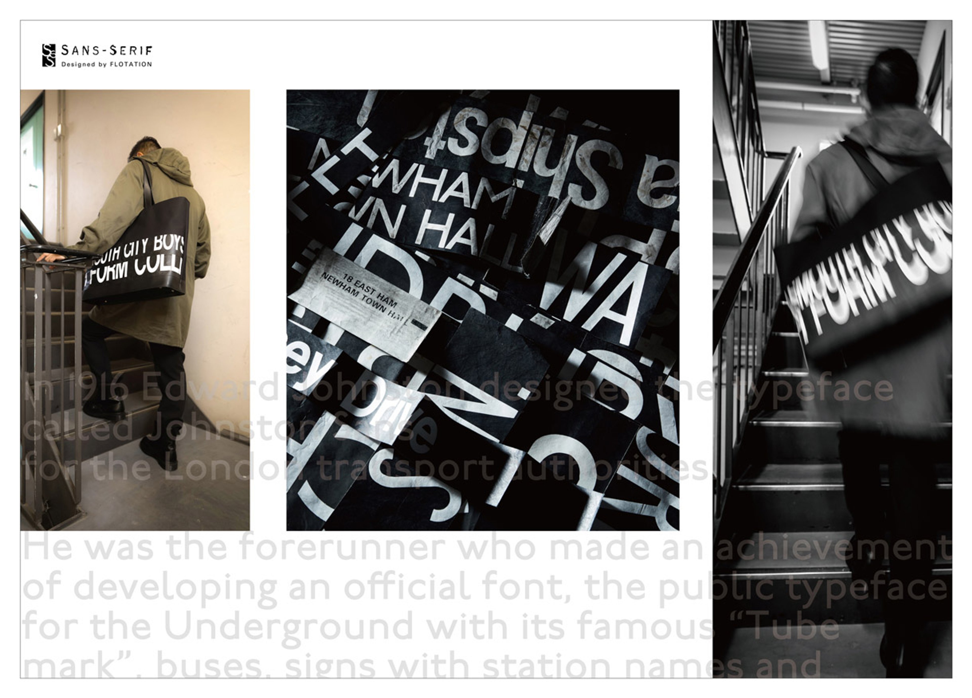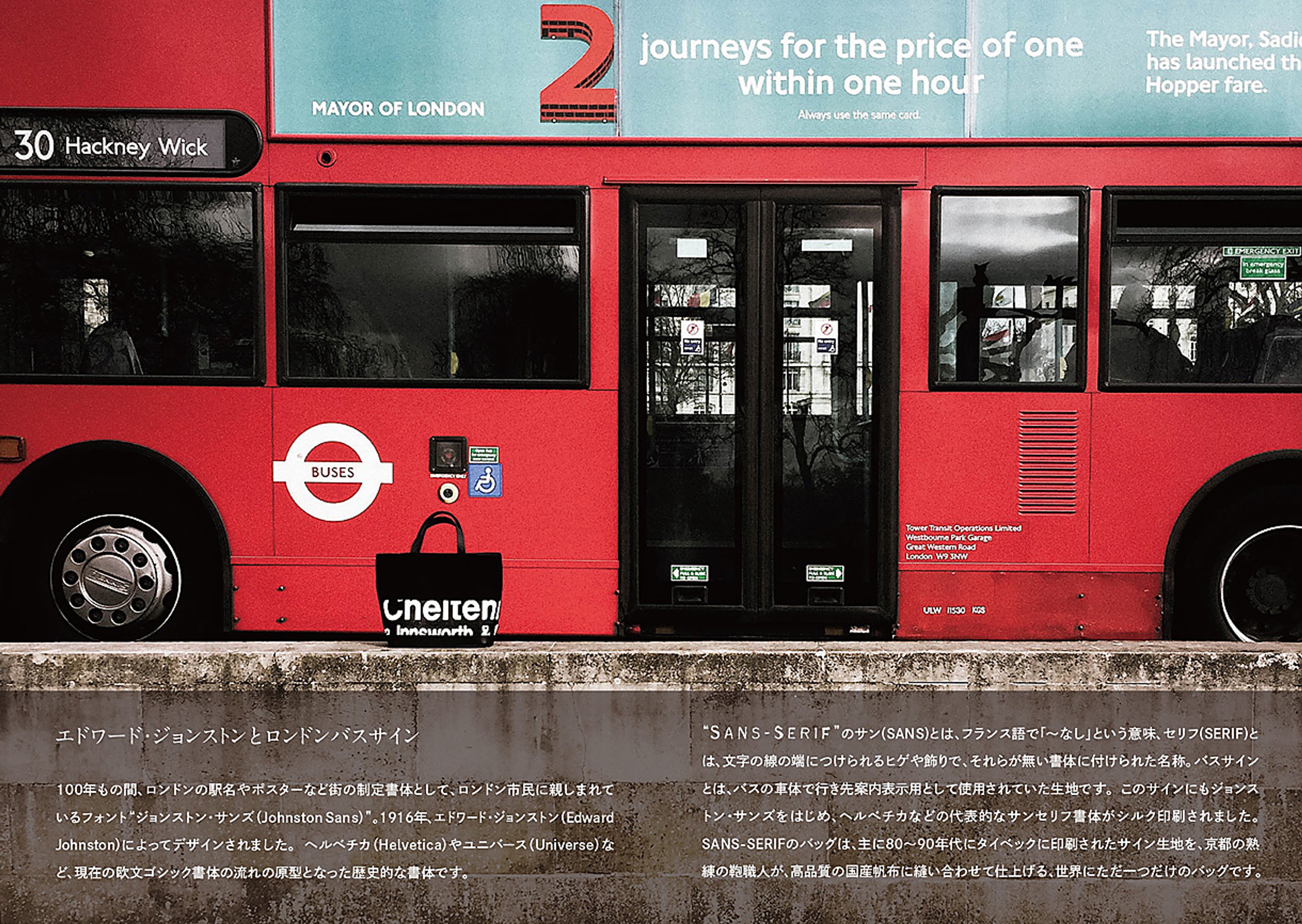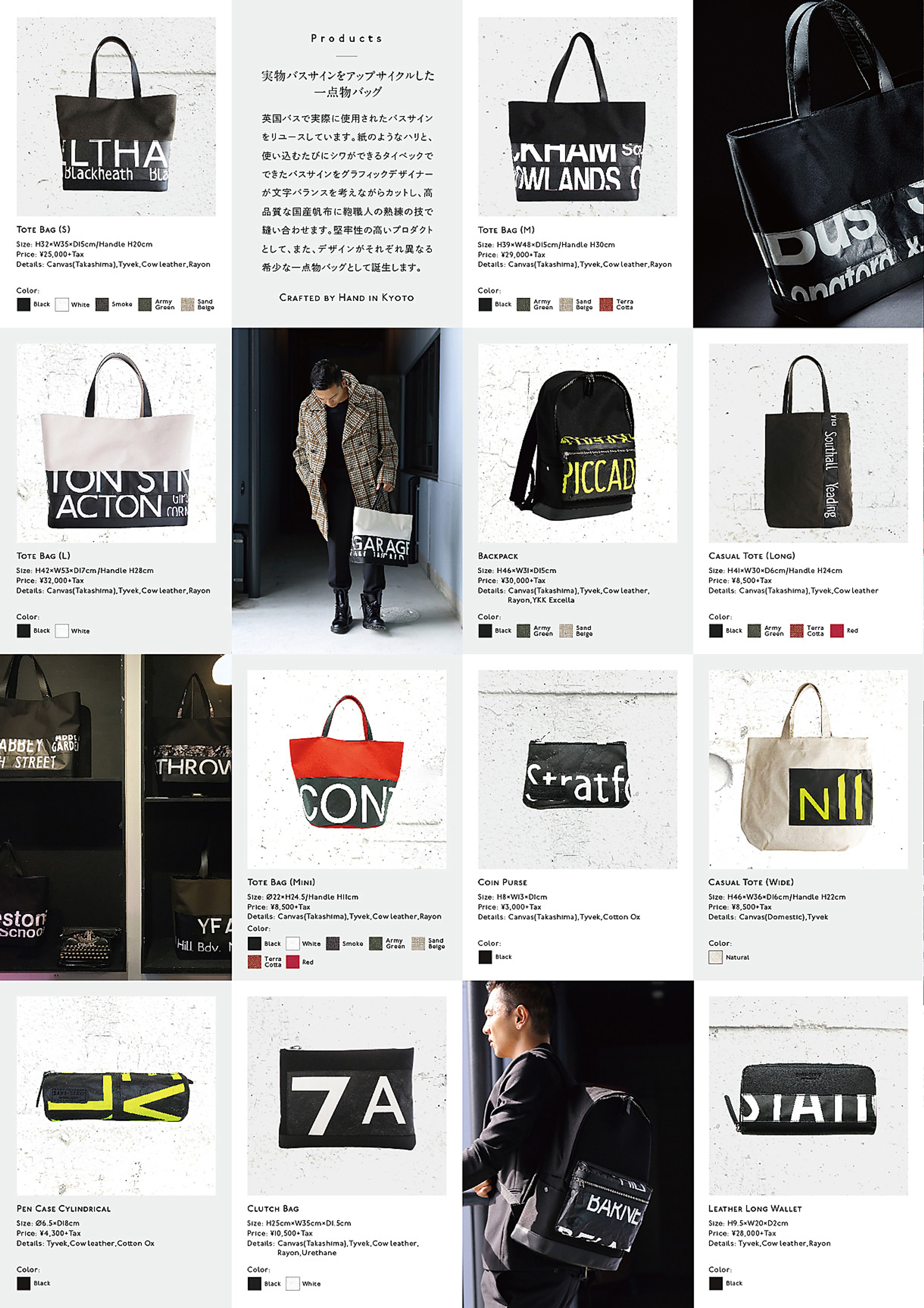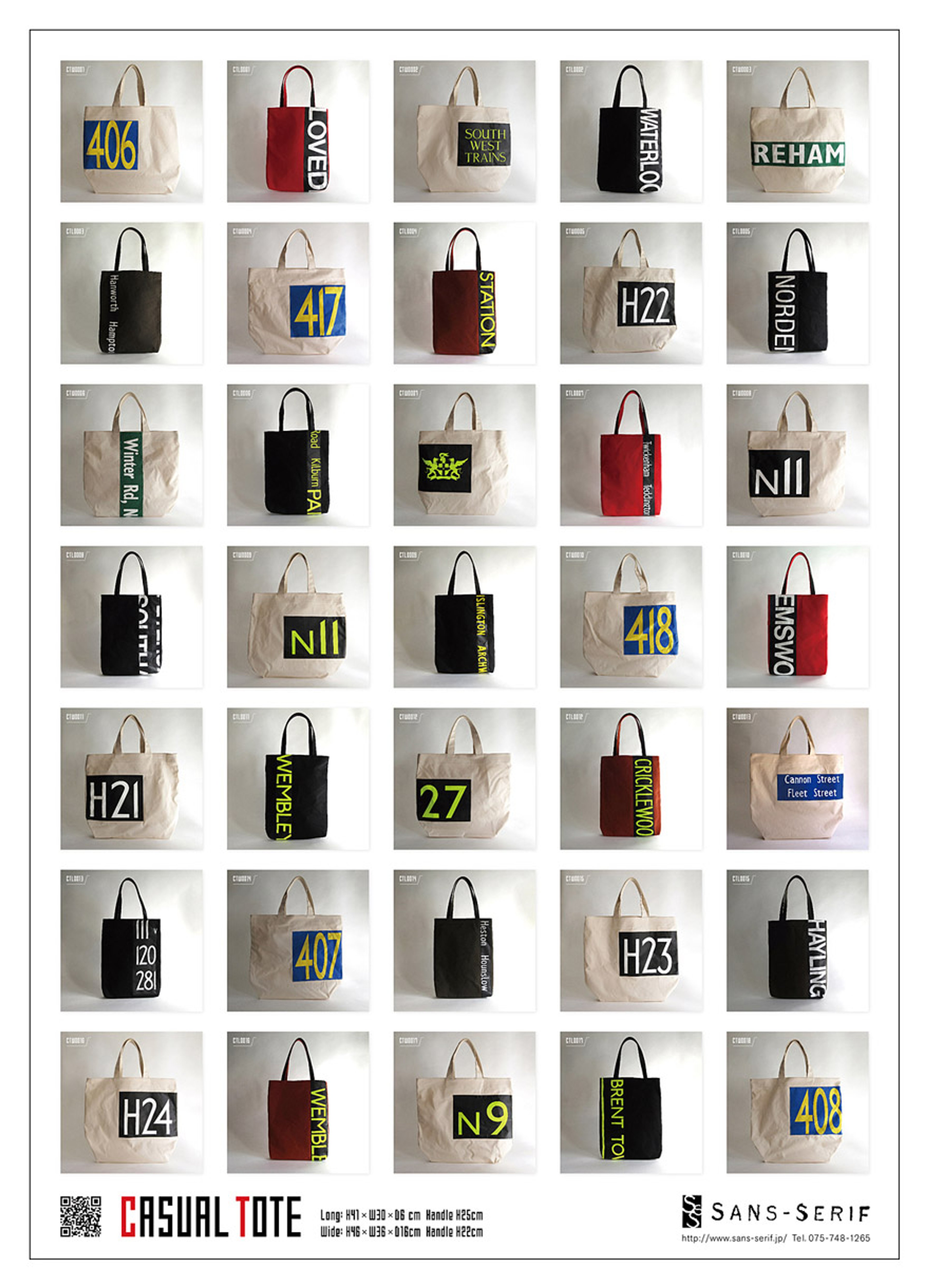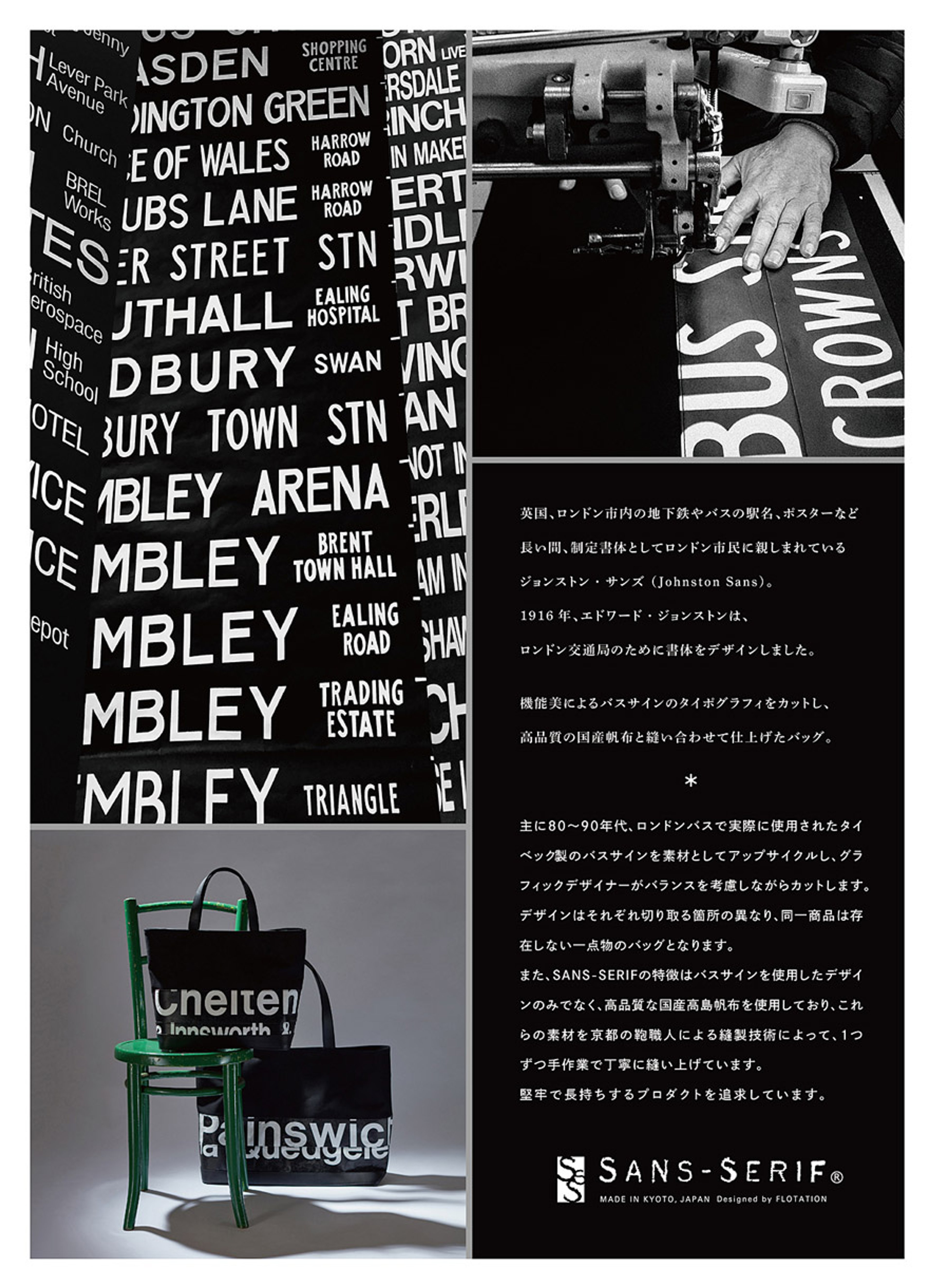 2016年よりスタートした鞄ブランド「SANS-SERIF」は、英国ロンドンバスの主に80〜90年代、役目を終えた行き先案内用のバスサインをアップサイクルし、日本の鞄職人が1つずつ手作業で国産帆布に縫い上げる一点物バッグが特徴です。また、使われずに眠っているUSEDやデッドストックのキモノ帯をアップサイクルするバッグや、パイナップル葉からできたヴィーガンレザーを使用したアイテムも展開。今後はさらにサスティナブル・アイテムの幅を拡げ、天然由来の素材と廃棄される生地との融合をはかります。弊社の物販事業として展開しているブランドです。